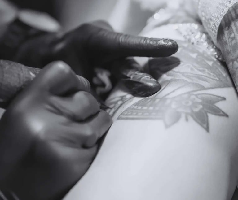 Le prestige du studio et la magie de l'événement. Eden opère en collaboration exclusive avec le studio Oak & Brass Tatouage de Terrebonne. Cette association est née d'une vision commune : porter l'art du tatouage au-delà des murs du studio pour l'inviter dans les moments les plus précieux de votre vie. Pourquoi cette collaboration change tout pour votre mariage ? En choisissant Eden pour votre mariage, vous bénéficiez du savoir-faire et de la réputation d'artistes d'élite. Chaque motif est conçu avec la précision et le style qui font la renommée du studio de Terrebonne. Notre protocole d'hygiène mobile est calqué sur les standards d'excellence de Oak&Brass. Nous transportons la rigueur d'un studio professionnel directement sur le lieu de votre réception. Profitez de planches de "flashs" exclusives, mêlant l'élégance romantique d'Eden à la touche artistique unique de l'équipe du Oak&Brass.